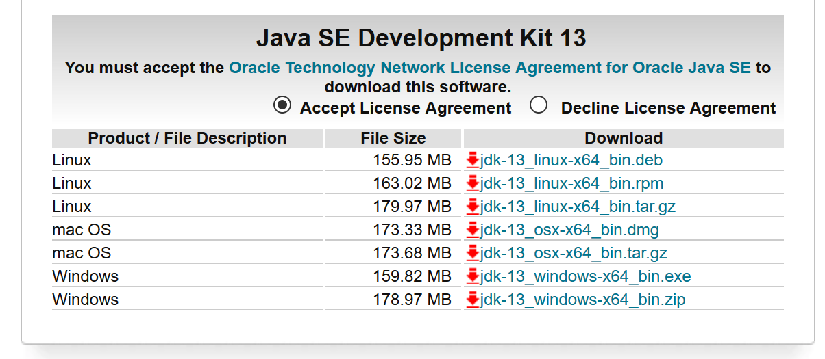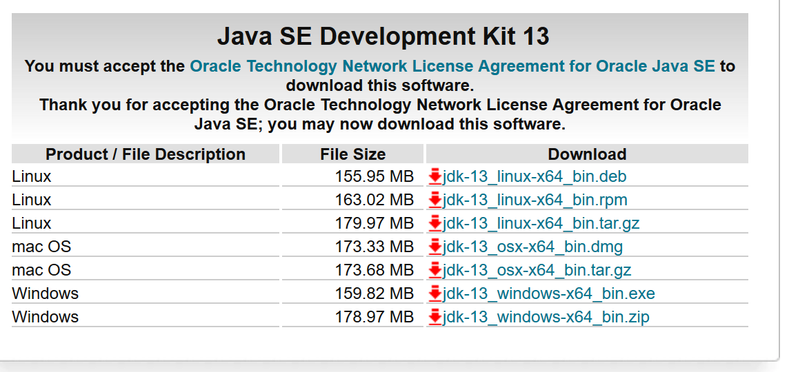 Vous devez choisir la version pour Linux : jdk-13_linux-x64_bin.tar.gz